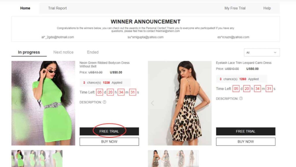 O Free Trial Center não está disponível no site — apenas no aplicativo oficial da Shein.